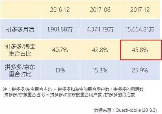 光便宜还不行,得有区分度。根据企鹅智库和QuestMobile大数据呈现的《拼多多用户研究报告》显示,2018年4月前的样本数据表明,在所有电商平台中,拼多多和淘宝用户重合度更高,2017年底,有45.8%的拼多多用户同时也是淘宝用户。两个平台中部分人群出现高度重合性。