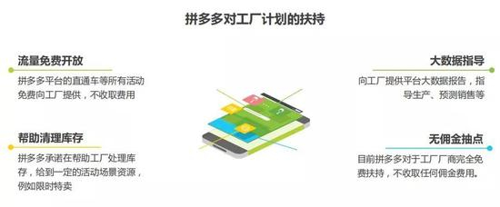 而拼多多给拼工厂计划提供了较强的扶持,主要表现为以下方面:①流量层面,直通车等活动免费向工厂提供;②数据层面,向工厂提供平台大数据报告,指导生产、预测销售等;③库存层面,拼多多承诺在帮助工厂处理库存,给到一定的活动场景资源,例如限时特卖;④盈利层面,目前拼多多对于工厂厂商完全免费扶持,不收取任何佣金费用。