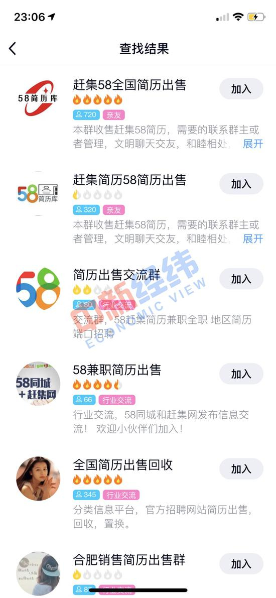 在QQ群查找中以“简历出售”为关键词进行搜索,出现了“赶集58全国简历出售”“简历出售交流群”“全国简历出售回收”等多个疑似简历倒卖群。中新经纬随机添加了几位卖家。
