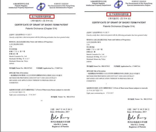 从丸美天猫旗舰店的说明中,可见该酒糟提取工艺已经应用到丸美日本酒系列。但奇怪的是,丸美日本酒系列在日本制造、研发,但该技术为什么不在日本申请专利,也不在中国大陆申请专利,而在香港申请专利,且此专利为短期专利。
