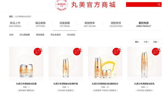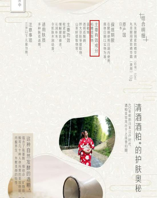 在网上,记者查到MARUBI TOKYO日本酒御龄冰肌系列在日本上市的消息,声称 “高端线MARUBI TOKYO首先推出的系列,运用了世界上酿造工艺最复杂的寒造酒粕酿造原理,通过低温寒造发酵,孕育出35种冻龄精萃,打造出亚洲女性心中的顶级抗衰产品,冻龄一生物。”