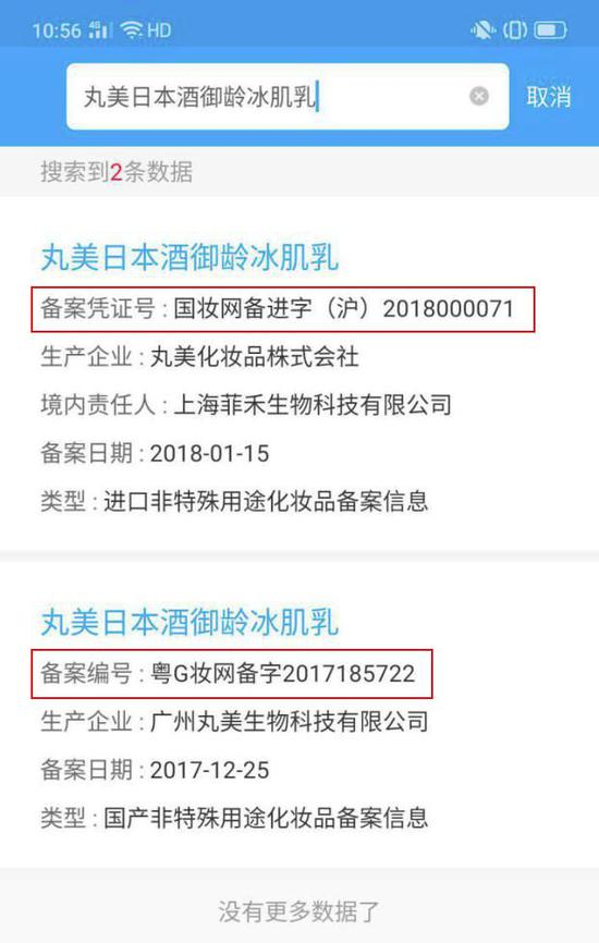 丸美的天猫官网标注这是一款日本进口产品,《商学院》记者查询国家药监局化妆品监管app,却看到该产品既有国妆网进口编号:国妆网备进字(沪)2018000071也有粤G网备字2017185722,后者为国产非特殊化妆品。