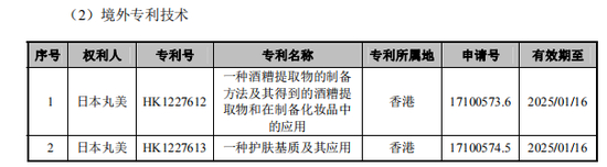 但是记者查遍丸美招股申请书中有关的发明专利,并未找到稻糟提取物这一项,但是在境外专利中查到类似的“一种酒糟提取物的制备方法”,这只是一种工艺的专利。