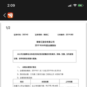 7月7日晚间,御家汇披露2019年上半年业绩预告,预计公司上半年归属净利同比下降超九成。预告显示,御家汇预计2019年上半年归属净利润为100万元-600万元,较公司上年同期盈利6503万元同比下降90.77%-98.46%。公司上年同期盈利6503万元。