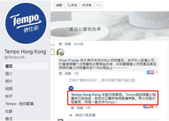 “Tempo Hong Kong”在“Chan Franky”的留言下方回应称,“Tempo在该媒体(TVB)上的广告已经完结,我们也正在重新检视宣传策略。”↓