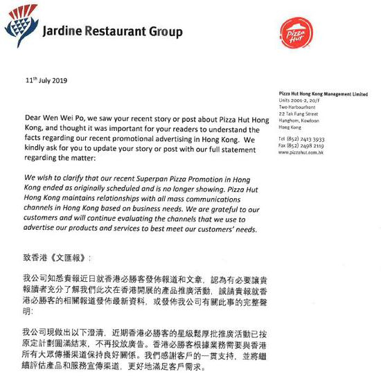 除此之外,同样被传打算撤回TVB广告投放的香港必胜客今天在回复环球时报英文版记者询问时表示,香港必胜客近期的“星际松厚批”推广活动已结束,“不再投放广告”。