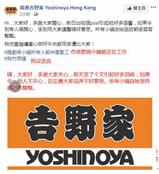 然而,香港吉野家脸书账号12日下午又发文称,“所有小编由始至终都系齐齐整整”,贴文结尾还称“我没话讲”。↓