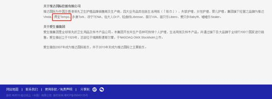 维达国际控股有限公司2015年在其官网的新闻稿中明确提到,“维达国际为中国及香港领先卫生护理品牌销售商及生产商,四大业务品类包括生活用纸(‘纸巾’)、失禁护理、女性护理、婴儿护理。集团旗下经营之品牌为维达Vinda、得宝Tempo、多康Tork、添宁TENA、包大人Dr.P、轻曲线Libresse、薇尔VIA、丽贝乐Libero、爱贝多Babyfit、嘘嘘乐Sealer。”↓