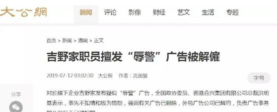 香港《大公报》及《文汇报》12日称,拥有吉野家香港经营权的香港合兴集团有限公司总裁、全国政协委员洪明基表示对吉野家脸书小编“暗骂香港警察”的发生感到极为愤怒,已和涉事的广告公司解约,并解雇了负责广告事务的公司员工。↓