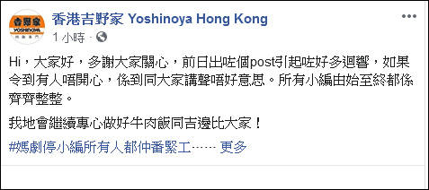 “大家好,多谢大家关心,前日(10日)的帖文引起很大反响,如果让人感到不快,在此跟大家道歉。所有小编自始至终都齐齐整整。我们会继续为大家专心做好牛肉饭和火锅。”