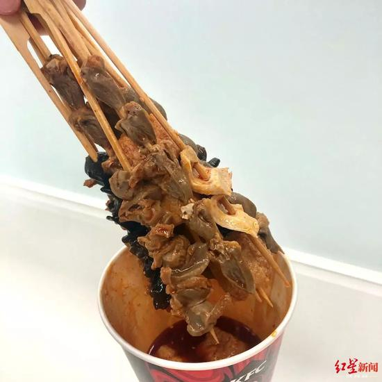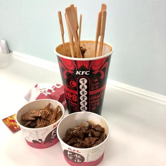 @发仔:肯德基出的串串,再怎么也要尝一回。钵钵鸡的既视感,摸起来还是温热的,油很多,看起色泽鲜亮。每种都吃了,牛肚最香!其次是鸡郡肝,脆脆的,好吃好吃!