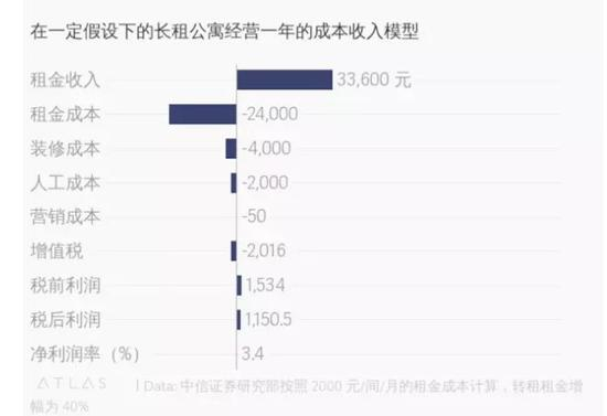 根据中信证券的测算,长租公寓品牌如果适用 6% 增值税率和 20% 的转租租金增幅,净利润率约为 -10.3%。当转租租金增幅扩大至 40% 时,净利润也仅为 3.4%。在所有开支中,租金成本占七成、装修占一成,其余为人工、营销和税费支出。