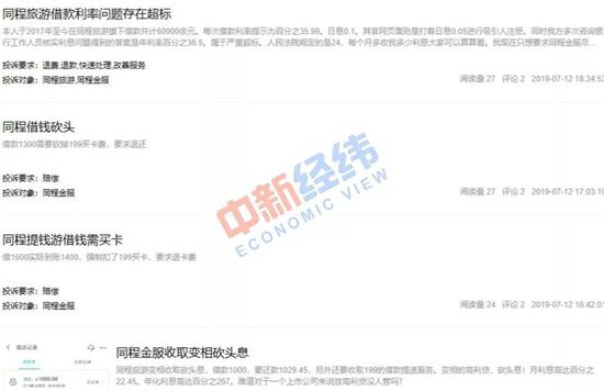 中新经纬在21聚投诉平台上发现,从今年5月至7月,关于同程旅游“砍头息”“暴力催收”等投诉信息多达277条,在黑猫投诉上也有100多条类似投诉。