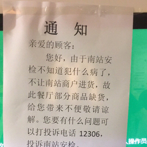 7月21日,有网友发帖称,北京南站一家麦当劳门店在收银台张贴公告,“怒怼”南站安检,称店铺进货受阻。公告显示,“亲爱的顾客:您好,由于南站安检不知道犯什么病了,不让南站商户进货,故此餐厅部分商品缺货,给您带来的不便敬请谅解。您要有什么问题可以打投诉电话12306,投诉南站安检。”