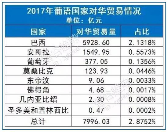 枢纽上。除了巴西外, 其他葡语国家和中国的贸易额微乎其微。就是把地区全部加起来,一年贸易量也不过7996亿元人民币,占比全国2.8%。