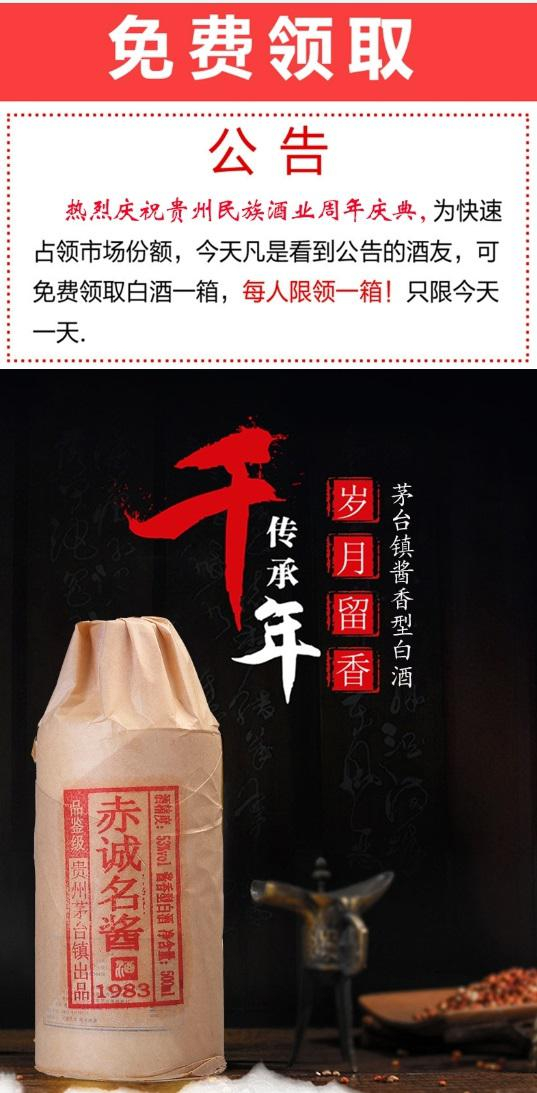 点击后的广告内容显示,可以“免费领取”的白酒名叫“赤诚名酱1983”,产于“北纬28度的酒都茅台镇”,“每一瓶均采用核心原浆以酒调酒,以7个轮次、不同香型、不同年龄的陈年窖藏原酒和三年基酒勾调而成,不添加任何物质,是典型的纯粮固态发酵原酒勾兑。”