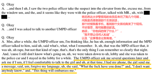 当时女方回答说,“我被强奸了,但不是那种意义上的强奸”。该警员随后向女方指出,强奸在美国属于非常严重的事件,如果有任何事情警方将全力帮助她。女方表示,她不想要警方做任何事。