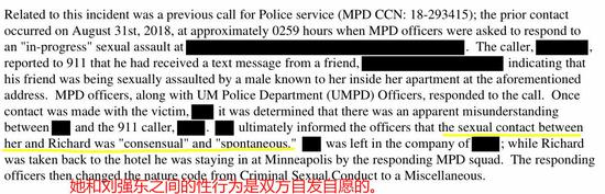 女方还曾告诉警员,她和刘强东之间的性行为是双方自愿的。而在之后的证词中,女方则反复强调“有过拒绝”。