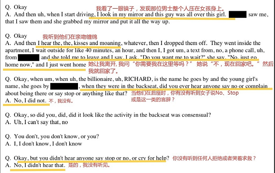 司机称,刘强东把女学生从车前拉到后座。后来,他从后视镜中看到两人亲吻、抚摸,且刘强东曾几乎整个人都在女学生身上,但是,他在车程中并没有听到女生说不、停下来或求救。