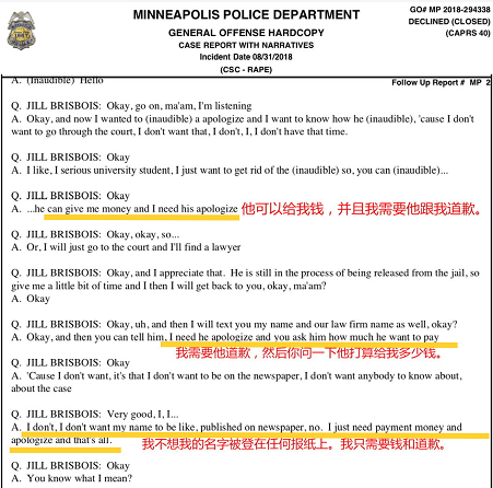 此次证词中,还有一段女方与刘强东律师的对话。女方在与律师交流中表示,“我不想我的名字被登在任何报纸上,我不想任何人知道这件事,我只需要钱和道歉”。
