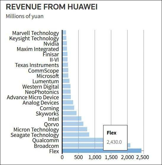 众所周知,华为在美国有着众多的供应商。彭博社统计的数据显示,仅去年第三季度,伟创力就从华为获得了24.3亿元人民币的收入,是从华为获利最多的美国供应商,这部分收入约占其当季总营收的5%。