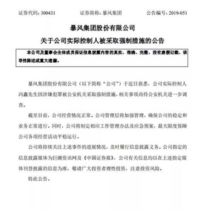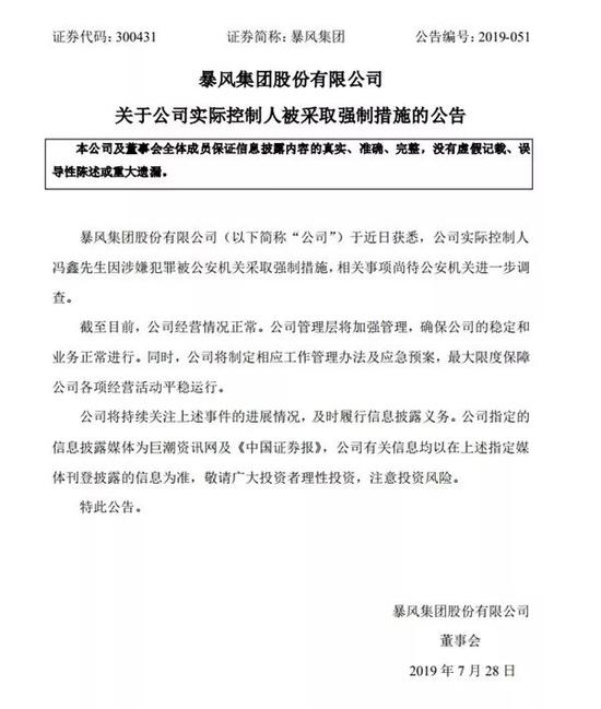 7月28日晚间,暴风发布公告,公告称公司实际控制人冯鑫因涉嫌犯罪被公安机关采取强制措施,相关事项尚待公安机关进一步调查。截至目前,公司经营情况正常。公司管理层将加强管理,确保公司的稳定和业务正常进行。同时,公司将制定相应工作管理办法及应急预案,最大限度保障公司各项经营活动平稳运行。