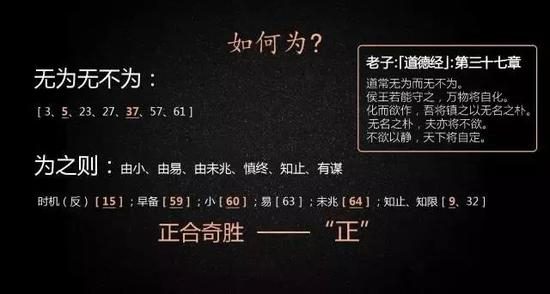 他导的一个结论是为什么他觉得这些东西不会常有?因为自然之道就是每时每刻都在变化。一个事情产生,他就开始准备死亡,任何一个事情发生了,他就准备消失,所以他知道万物都是和合之后,知道自然之道,就是有出现必有灭亡。他如果确认这个道理的时候,他自然就不想把持,他自然觉得没有意义,所以我觉得这是前面我们发现了一个和合和自然。大部人讲《道德经》都是虚的理论,是观念,但《道德经》因为真的是指导我工作,我的工作的基本方法论都是从《道德经》里获得的,都是有源头的,可能过程当中也学过很多没用的书,但后来还是回归到道德性的基本原则,所以《道德经》他们说无为,其实不是,如果认真读《道德经》,都会看到里边明确地写了一句叫无为无不为,就没有任何事是不作为的。