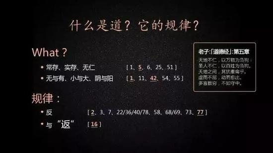 那《道德经》是什么呢?我们总结一下,它讲了《道德经》的道的规律。第一与常人看的东西是相反的,相反的地方才能看到事物另外一个更真实的一面。