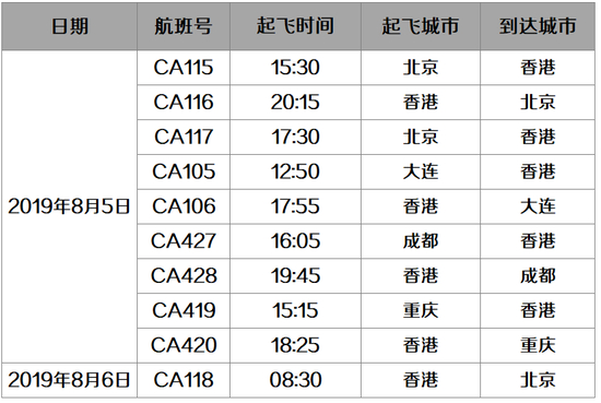 受8月5日香港国际机场服务保障能力限制影响,国航部分进出港航班取消,后续国航将根据香港国际机场运行情况,动态调整航班。具体航班取消信息如下: