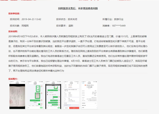无独有偶,在中国质量万里行消费者投诉平台同样也有消费者投诉:“2019年4月18日下午约3点半,本人被网络诈骗人员欺骗在同程旅游上购买了3张当天的香港迪士尼门票,价值1515元。”之后经过多次联系未果,该网友怀疑骗子是同程旅游员工,他们故意拖延时间来获取利益,因为当时同程不同意冻结门票不让骗子使用,之后同程旅游客服已经不回应信息。
