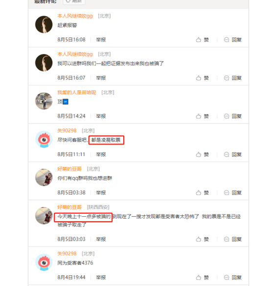 《华云网》注意到,在这条投诉的评论区,有不少网友表示同样被骗。如:“我可以进群吗我们一起把证据发布出来我也被骗了”;“尽快问客服吧,都是凌晨取票”;“今天晚上十一点多被骗的 到现在了一搜才发现都是受害者太恐怖了 我的票是不是已经被骗子取走了”。