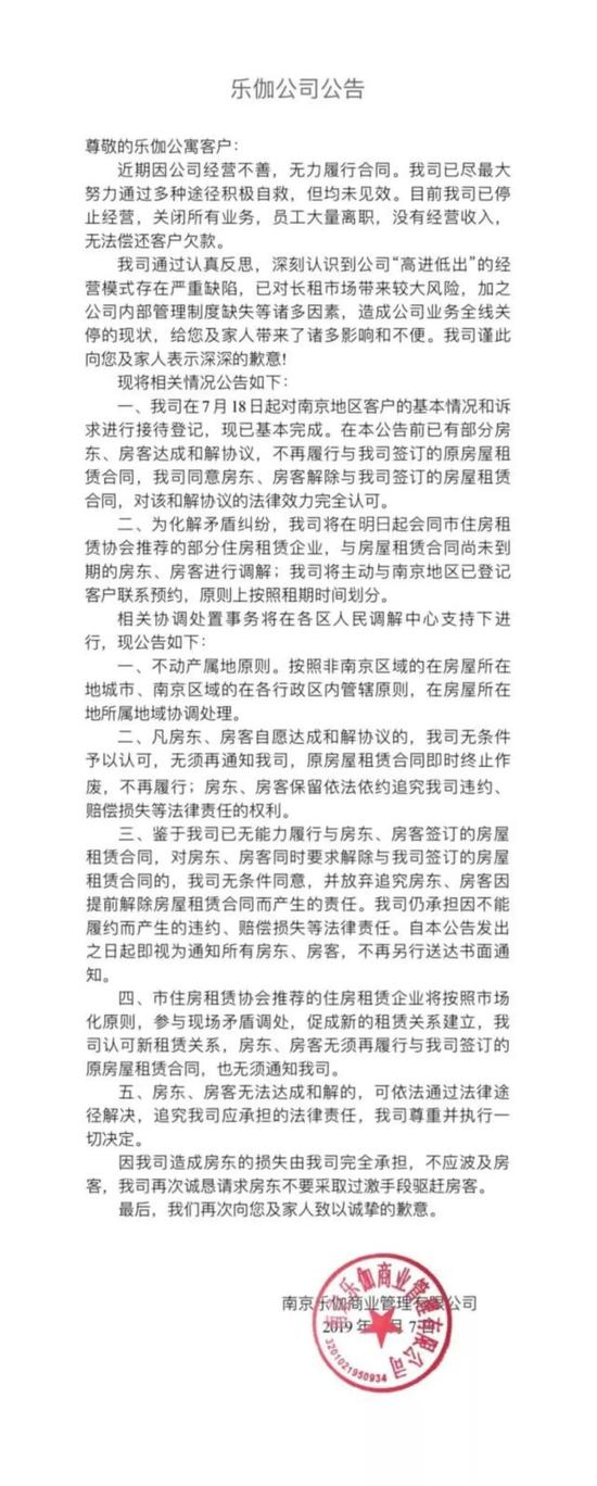 另外,乐伽公寓还表示,自7月18日起,公司对南京地区客户的基本情况和诉求进行接待登记,现已基本完成。在本公告前,已有部分房东、租客达成和解协议。同时,8月8日起,会同南京市住房租赁协会推荐的部分住房租赁企业,与房东和租客进行调解。