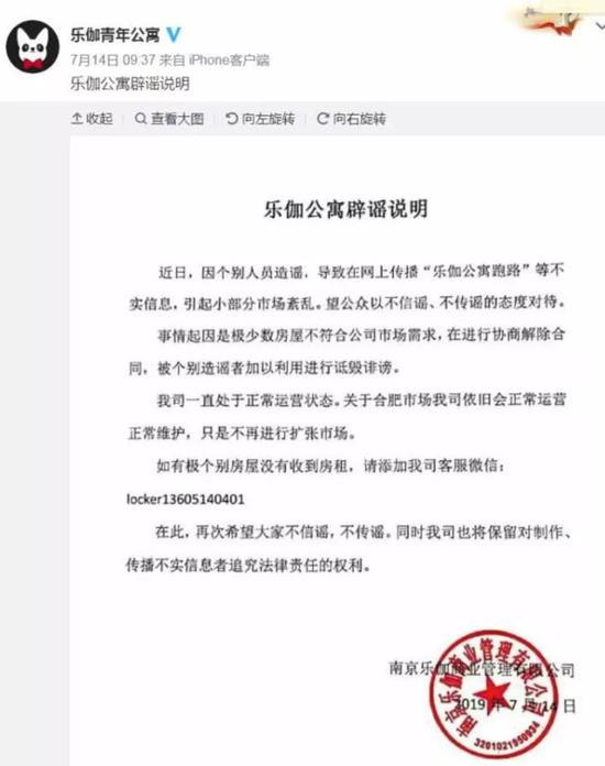 但7月14日,乐伽公寓还在辟谣。当天乐伽公寓在其官方微博发布公告称,因个别人员造谣,导致在网上传播“乐伽公寓跑路”等不实消息,引起小部分市场紊乱。公司一直以来处于正常运营状态,希望大家不信谣,不传谣。