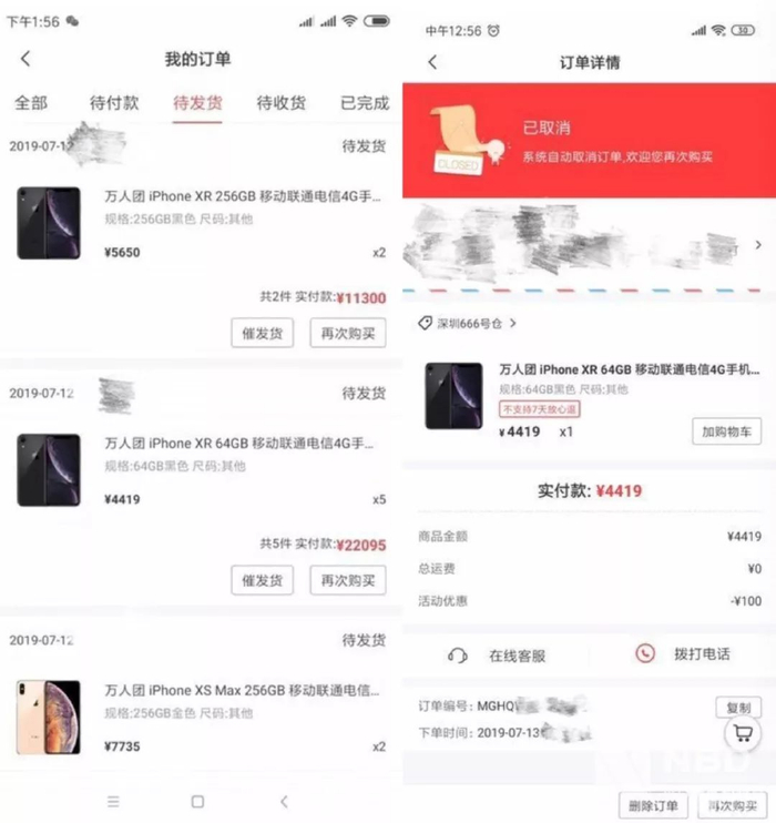 在与每日经济新闻(微信号:nbdnews)记者交流的过程中,李明奇直言,之所以会产生那么大金额的订单,是因为他下单的数量比较多。在特奢汇平台上下单的笔数有33笔,购买了68台iPhone手机,涉及商品价值37万元,最早的订单是在6月25日下的。根据他提供的下单截图显示,当时特奢汇承诺的发货时间为下单后的15天后,但至今没有收到货,咨询客服、申请退款,他遭遇了赵科一样的情形。