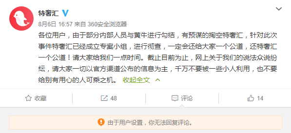 此外,特奢汇还于8月6日在微博中表示,由于部分内部人员与黄牛进行勾结,有预谋的掏空特奢汇,针对此次事件特奢汇已经成立专案小组。