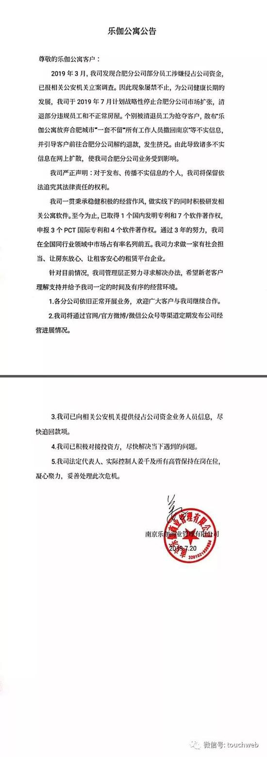 “凡房东、房客自愿达成和解协议的,公司无条件予以认可,无须再通知乐伽,因公司造成的房东损失,由公司完全承担,不应波及房客,诚恳请求房东不要采取过激手段驱赶房客。”