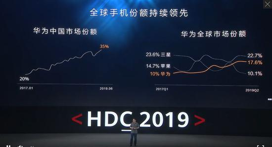 余承东在开发者大会现场介绍,上半年,华为消费者业务表现稳健。智能手机发货量(含荣耀)达到1.18亿台,同比增长24%,PC出货量实现300%增长,可穿戴设备出货量实现200%增长。2019年二季度,华为手机在国内市场份额达到35%,在全球达到17.6%,仅次于三星。余承东表示,没有制裁的话,发货量可能达到全球第一或者并列第一。