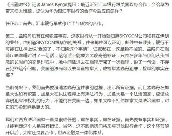 在回答《金融时报》记者提出关于“汇丰协助美国政府给华为制造麻烦”的问题时,任正非表示,这家银行从一开始就清楚Skycom在伊朗的业务,也知道Skycom与华为的关系。华为和这家银行之间的邮件可以证明,上面还有银行的LOGO呢。所以从法律的角度来讲,他们不能说他们被骗了或者不知道,因为我们有证据。