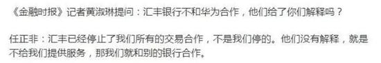 英国《金融时报》的报道还透露,汇丰曾于今年年初向中方解释说自己是“被迫”的。但在华为公司创始人任正非在接受《金融时报》采访时表示汇丰的说法有问题。