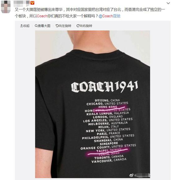 在国际奢侈品牌范思哲将香港、澳门、台湾列为国家一事还在发酵的同时,今日又有网友曝出同为国际奢侈品牌的蔻驰在其T恤产品和官网上也将香港、澳门和台湾列为国家。