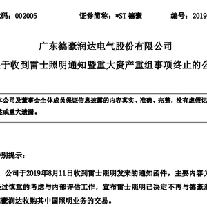 8月12日早间,广东德豪润达电气股份有限公司(证券简称:*ST德豪,证券代码:002005)发布公告称,8月11日收到雷士照明控股有限公司(以下简称“雷士照明”,股票代码:HK02222)发来的通知函件,宣布雷士照明已决定不再继续推进*ST德豪收购其中国照明业务的交易。