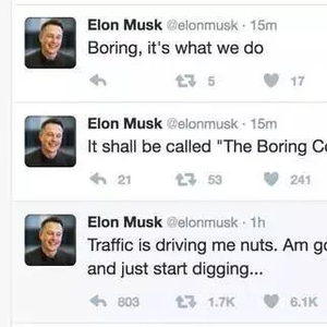 The Boring Company由马斯克创建,公司的创建源于一次马斯克的堵车事件。备受堵车困扰的马斯克发推文说:“堵车快把我逼疯了!我要造一台隧道挖掘机,开始挖隧道”。不到1小时,这个项目正式命名为“The Boring Company”,2小时之后他再次发推文:“我们真的要开始挖隧道了。”