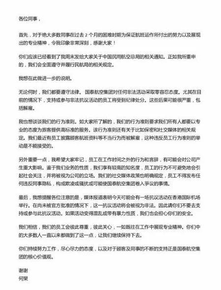 “对于最近有员工披露顾客航班资料等不当行为而被解雇,这种违反员工行为准则的举动是不能接受的。” 何杲在最新表态中称。但他同时提醒,“媒体报道表明今天(8月12日)可能会有一场抗议活动在香港国际机场举行。在尚未被官方批准的情况下,这一抗议活动将会被视为非法。因此请你们(员工)不要去支持或参与此抗议活动,如果活动变得混乱或带有暴力性质,我们也会担心你们的安全。”