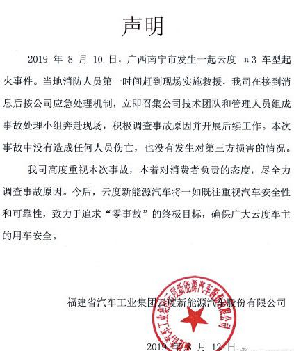 新京报讯(记者 秦胜南)8月10日,广西南宁市街头一辆云度π3新能源汽车自燃。福建省汽车工业集团云度新能源汽车股份有限公司(以下简称“云度新能源”)8月12日对此事发布官方回应表示,本次事故未造成人员伤亡,已成立事故调查小组,积极调查事故原因并开展后续工作。
