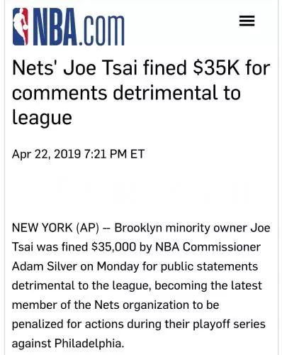 一件趣事是,今年4月,蔡崇信意外收到了一张来自NBA的3.5万美元罚单,原因是“发表不利于联盟的公开言论”。