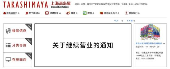 此前,6月24日,上海高岛屋在其官网发布了终止营业通知,称上海高岛屋将于2019年8月25日终止营业。