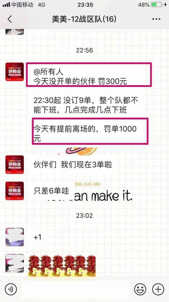 该员工告诉猎云网,总监组长暗示他们必须在天猫缴费1000元定13999元的套餐,并全程指导怎么做,“没到目标定单的,不能走,如果直接溜走,后续罚单更重。”