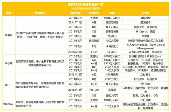 目前比较有代表性的公司有,针对中小餐饮商户的美菜网、美团快驴;服务于农贸市场及中小零售商的宋小菜;由传统企业裂变而来的供应链公司,如彩食鲜(永辉)、蜀海(海底捞),主要服务于大B客户;还有很多传统做批发生意出身的玩家,虽然没有资本的关注,却靠着多年积累的经验和人脉,在某一特定区域崭露头角。各家正处在快速布局当中,格局尚未形成。