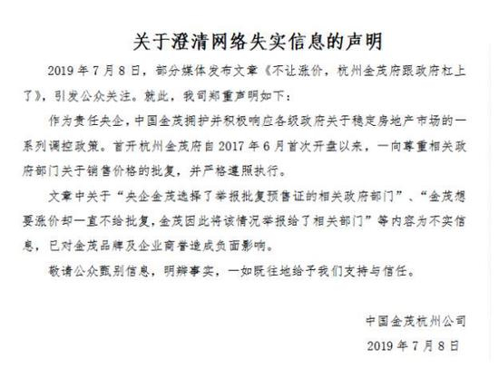 绿城打破限价一事,曾在杭州地产圈里引起不小的骚动,但也引来同行跟风试探。今年7月,有消息称金茂曾向杭州相关政府部门举报过此事,原因是沁园的“洋房产品”为伪洋房,但批出来的预售价却是洋房的价格系数。这一消息很快得到了金茂方面的否认,7月8日,金茂发布澄清公告,称:“中国金茂拥护并积极响应各级政府关于稳定房地产市场的一系列调控政策。首开杭州金茂府自2017年6月首次开盘以来,一向尊重相关政府部门关于销售价格的批复,并严格尊照执行。”公告中对于媒体所称“金茂府想涨价却一直未得到政府批复,因此将该情况举报给相关部门一事”明确否认。