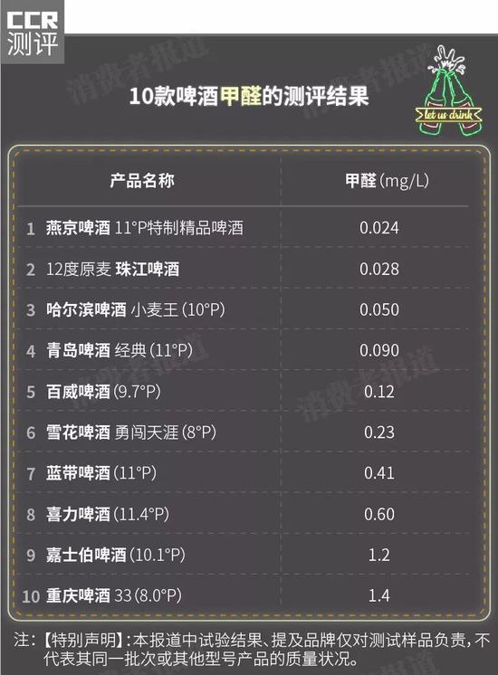 测试结果显示,10款啤酒均检出微量甲醛,但含量都未超出国标限值。